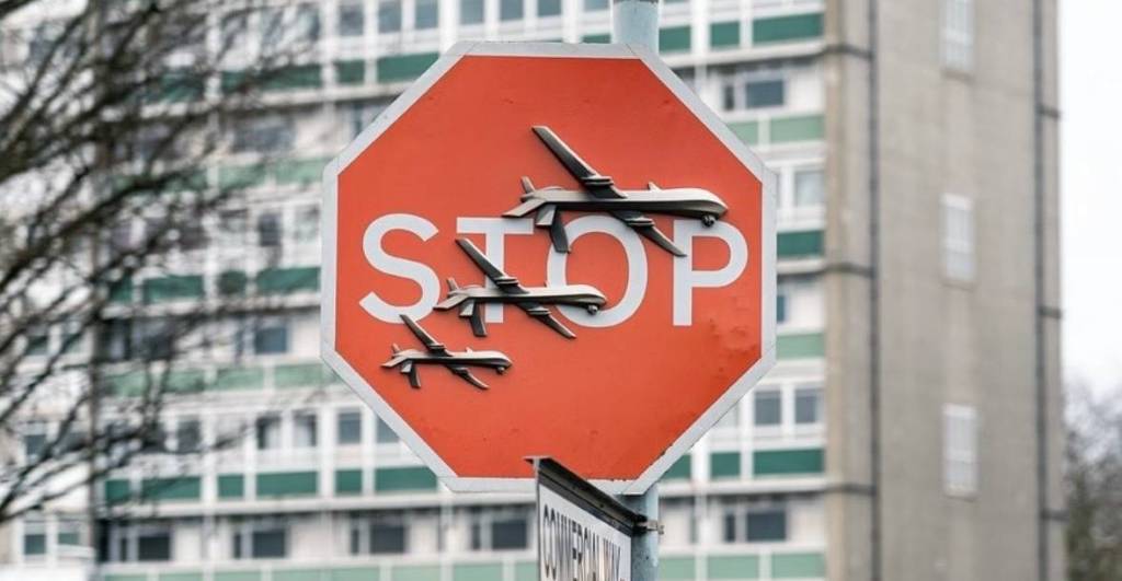 Imagen de la nueva obra de Banksy/Foto vía Instagram: @banksyPara los que no saben de qué estamos hablando, la nueva obra de Banksy se basa en una señal de tráfico de “alto” adornada con aviones de guerra en 3D. Pero quizá lo más sorprendente del asunto fue que horas después de que apareciera esta pieza en la calle y que el propio artista confirmara su autoría, se la robaron… así como lo leen.