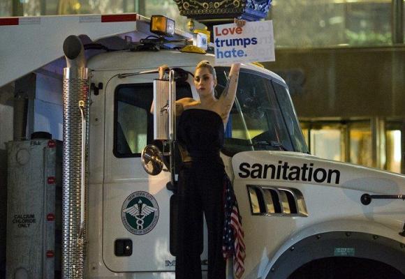 Luego, se dirigió a una de las icónicas Trump Towers, las torres del millonario del real state que se convirtió en presidente de los Estados Unidos, en un camión recolector de basura, y enarboló un nuevo eslogan: “Love trumps hate” (un juego de palabras con el apellido del presidente que significa “el amor triunfa sobre el odio”). Desde allí, publicó un nuevo tuit con una foto, en el que une sus dos nuevos hashtags: “Quiero vivir en un país de bondad, donde el amor triunfe sobre el odio”. (FUENTE: Posta)
