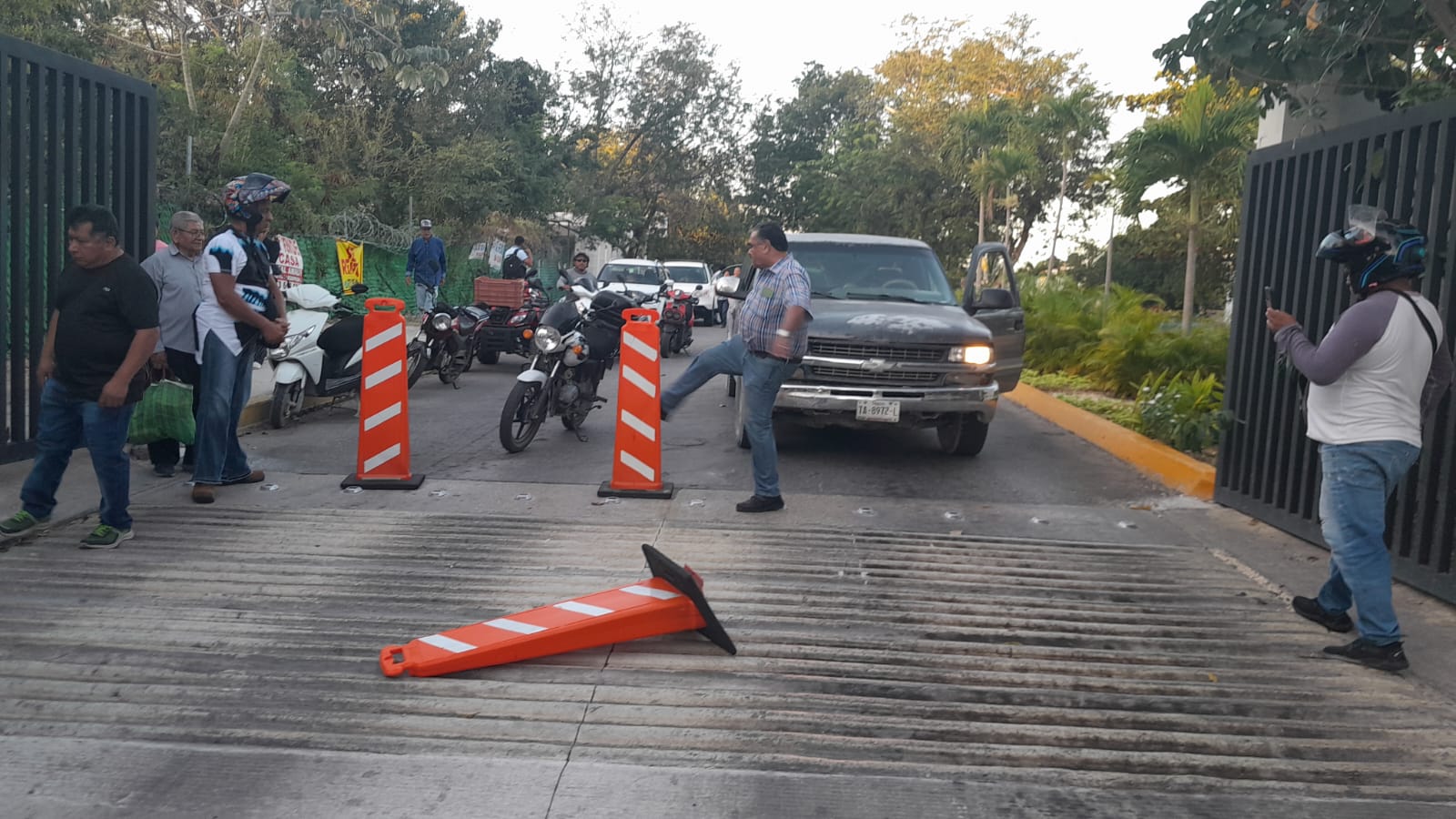 Ante este acto, el décimo tercer regidor, Marciano Toledo Sánchez, tiró los conos que habían colocado para impedir el acceso de los vehículos.