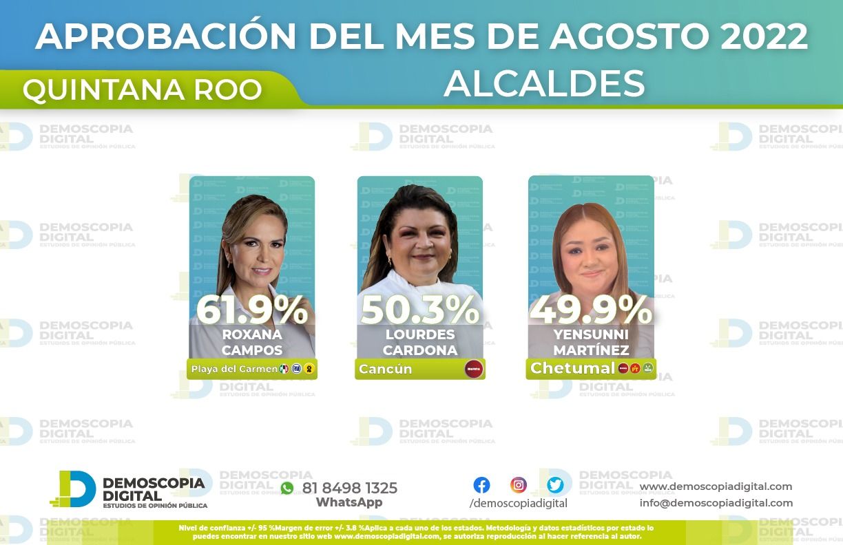 PLAYA DEL CARMEN, Quintana Roo, 03 de septiembre. – Lili Campos Miranda es la alcaldesa con mayor aprobación ciudadana en Quintana Roo en el mes de agosto con el 61.9 por ciento según la encuesta que realizó y publicó la casa encuestadora Demoscopia Digital, colocándola en el Ranking nacional en el sitio 30.