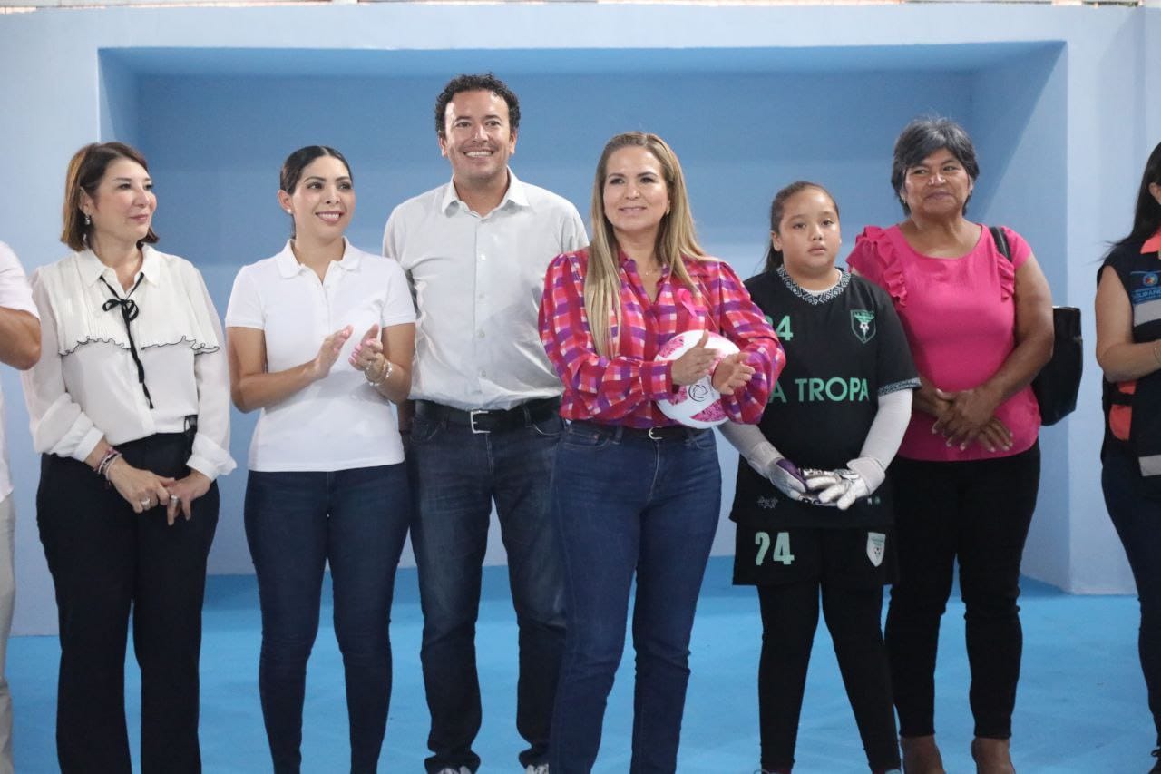 Playa del Carmen, Solidaridad, 5 de octubre de 2022.- En beneficio de equipos infantiles, la presidenta municipal Lili Campos inauguró la rehabilitación de la cancha de fútbol 7, ubicada en la unidad deportiva Luis Donaldo Colosio Murrieta.