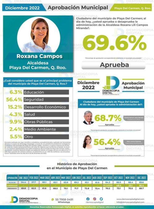 El estudio de opinión, realizado por la consultoría política Demoscopia, que evalúa a 50 alcaldes de diferentes municipios del país, incluye a las ciudades capitales, las zonas metropolitanas y los municipios destinos turísticos más importantes de México, como Solidaridad, el cual es el municipio más visitado en Quintana Roo.