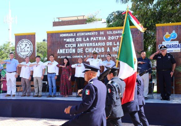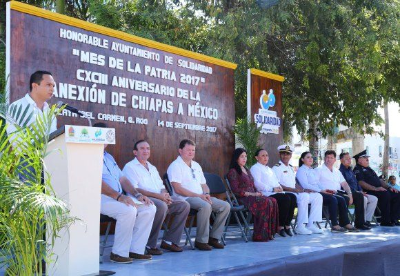 Durante la ceremonia cívica por el CXCIII Aniversario de la Anexión de Chiapas a México, el Presidente de la Comisión de Industria, Comercio y Asuntos Agropecuarios en el Cabildo solidarense, el regidor Gustavo Selvas Bonifaz, precisó que tanto la sociedad como el gobierno solidarense debe refrendar la colaboración entre ambos estados para que su recuperación sea pronta.