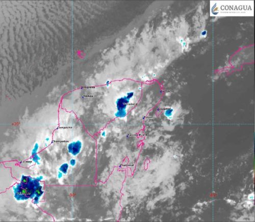 El pronóstico de lluvias para Campeche es de lluvias fuertes con puntuales muy fuertes (50 a 75 milímetros) y para Quintana Roo y Yucatán, intervalos de chubascos con lluvias puntuales fuertes (25 a 50 milímetros).