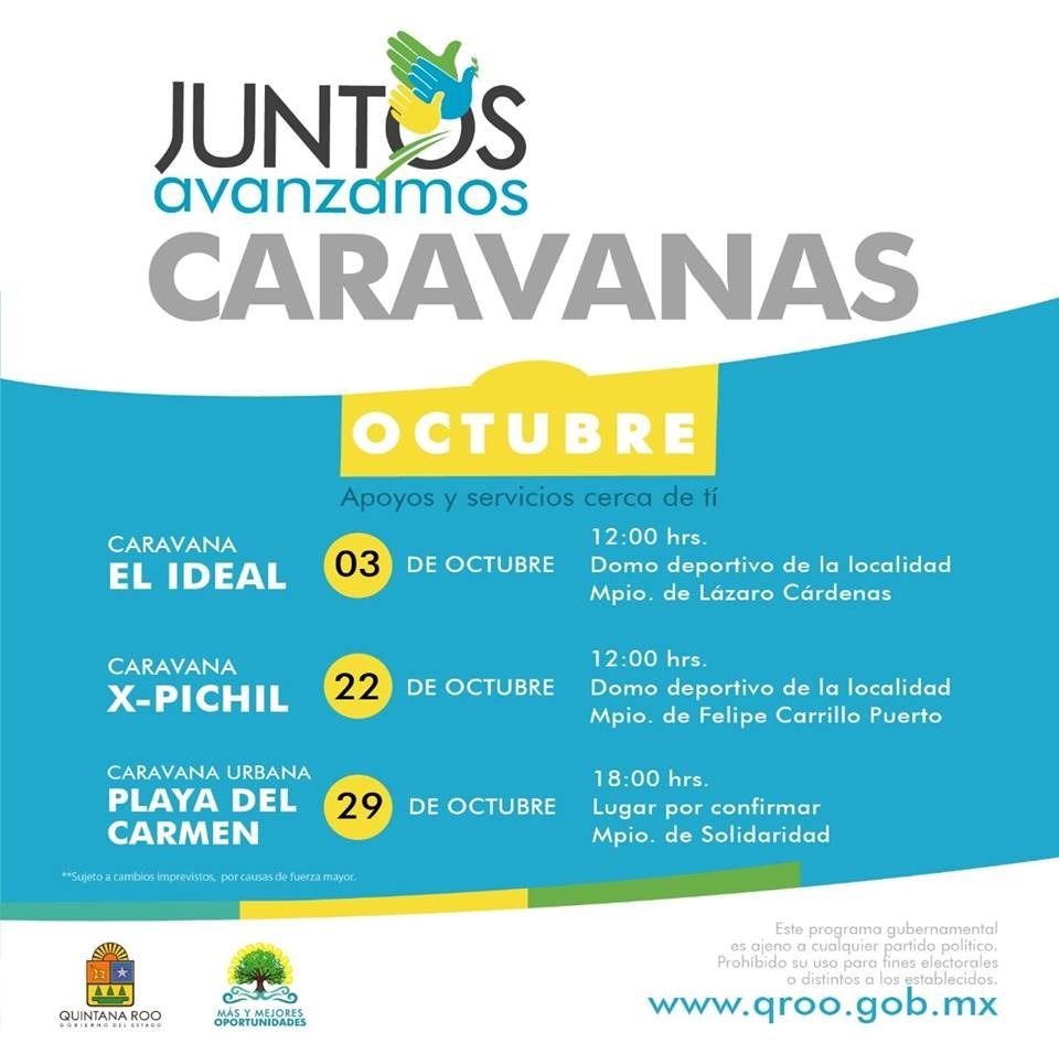 Así mismo, a las y los vecinos de Felipe Carillo Puerto, se les avisa que el 22 de octubre la caravana Juntos avanzamos estará en el domo deportivo de la localidad de X-Pichil. El 29 de octubre estará en Playa del Carmen acercando más y mejores oportunidades.