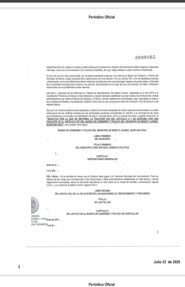 PLAYA DEL CARMEN, Quintana Roo, 26 de julio.– A partir de este fin de semana entraron en vigor las modificaciones al Bando de Policía y Buen Gobierno de Benito Juárez mediante el cual se permitirá aplicar las sanciones económicas y arrestos de hasta 36 horas a quienes no acaten las medidas sanitarias como el uso de cubrebocas en espacios públicos y mantener la sana distancia.