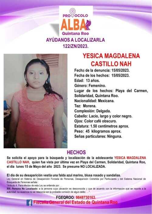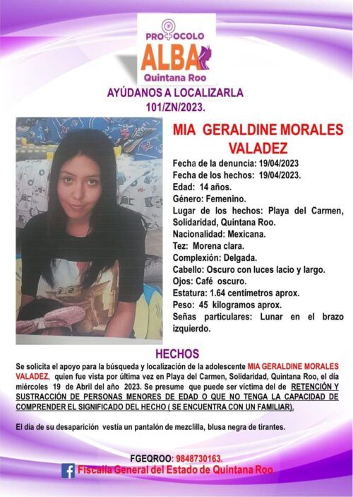 PLAYA DEL CARMEN, Quintana Roo, 19 mayo. –   La Secretaría de Seguridad Pública y Tránsito Municipal de Solidaridad informa que las menores Sofía y Hanna fueron localizadas en las inmediaciones de una plaza comercial del fraccionamiento Villas del Sol y en estos momentos se encuentran con sus familiares.