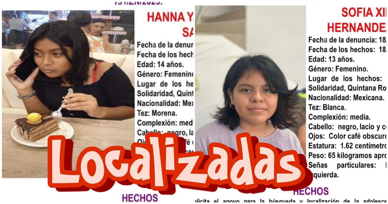 PLAYA DEL CARMEN, Quintana Roo, 19 mayo. –   La Secretaría de Seguridad Pública y Tránsito Municipal de Solidaridad informa que las menores Sofía y Hanna fueron localizadas en las inmediaciones de una plaza comercial del fraccionamiento Villas del Sol y en estos momentos se encuentran con sus familiares.
