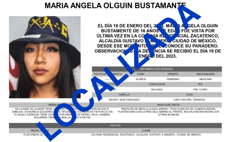 Elementos de la Policía de Investigación de la Fiscalía General de Justicia de la Ciudad de México hallaron a la joven María Ángela Olguín, de quien se dio a conocer su desaparición en inmediaciones del paradero Indios Verdes, al norte de la capital.