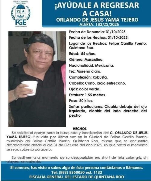La segunda desaparición ocurrió en la colonia Emiliano Zapata II de Felipe Carrillo Puerto, en el que un pescador identificado como Orlando de Jesús Yamá Tejero, fuese sacado a la fuerza de su domicilio el pasado 31 de octubre y que, hasta el momento, se desconoce su paradero.