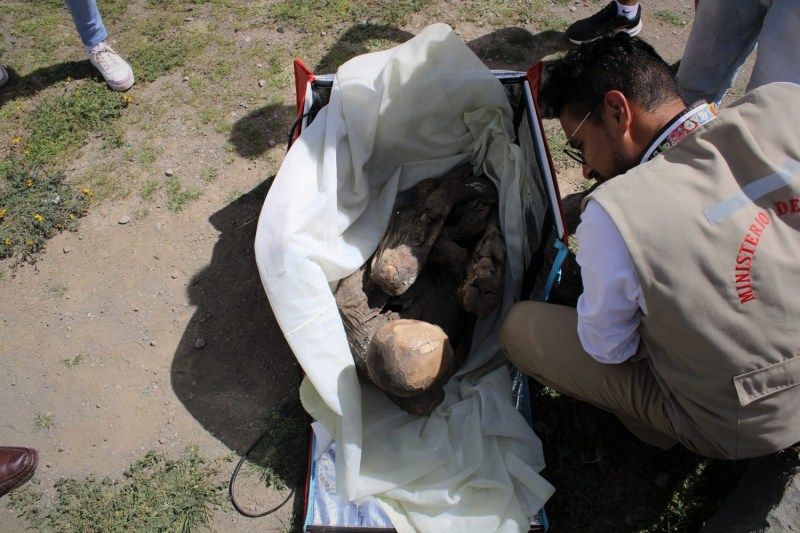 En su interior, había restos humanos en posición fetal y tejidos blandos con características correspondientes a una momia, lo que fue comunicado al Ministerio Público y al Ministerio de Cultura.