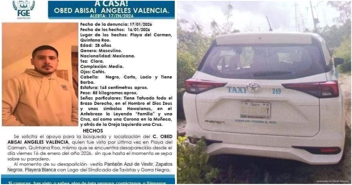 De acuerdo con los primeros reportes, el taxi era conducido por Obed Abisai Ángeles Valencia, de 28 años de edad, quien fue visto por última vez la noche del viernes en el cruce de la avenida 30 con las avenidas Benito Juárez y Constituyentes. En ese punto habría abordado un servicio con destino al Aeropuerto Internacional de Tulum, al cual nunca llegó.
