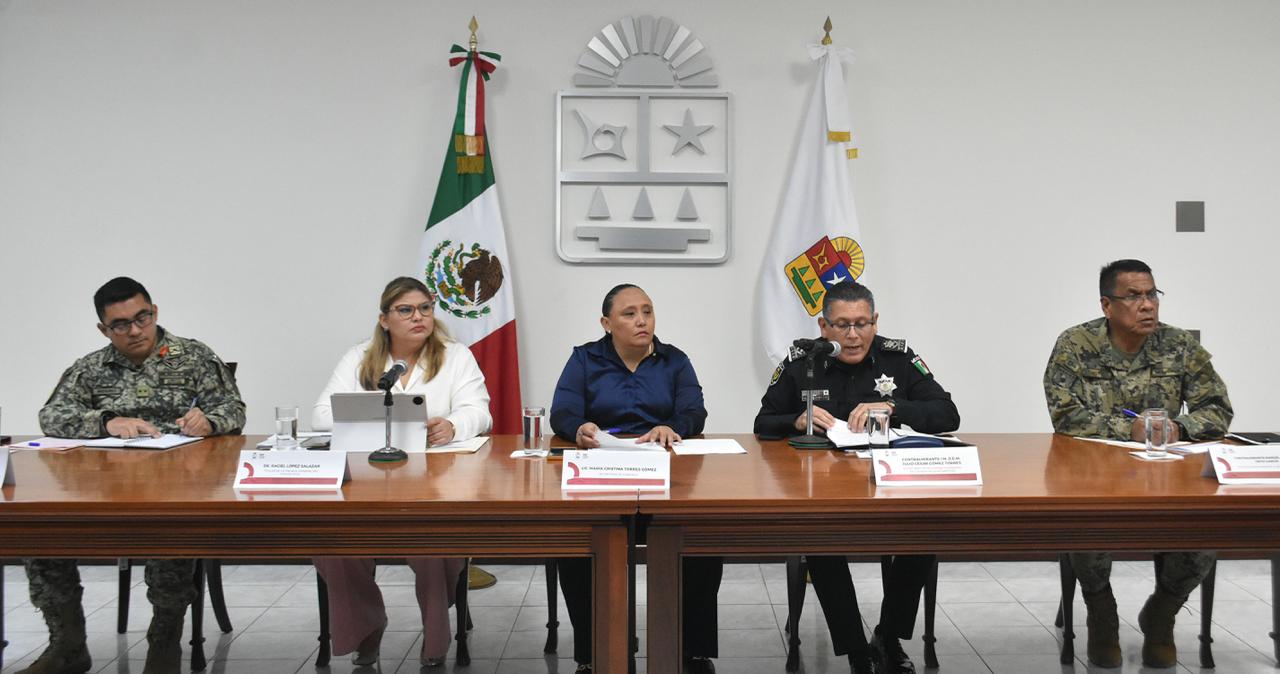 En la conferencia estuvieron presentes, además, Cristina Torres Gómez, Secretaria de Gobierno; Contralmirante Julio César Gómez Torres, Secretario de Seguridad Ciudadana; Teniente Coronel de Caballería Subjefe de Estado Mayor Carlos Gerardo Méndez de la Cruz, en representación del Comandante de la 34 Zona Militar, General de Brigada Diplomado de Estado Mayor Fidel Mondragón Rivero y el Contralmirante Manuel Baltazar Ortiz García, Jefe de Estado Mayor de la XI Zona Naval.