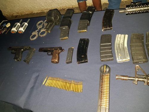 Por lo que en las primeras horas del día de hoy, se llevó a cabo la detención, en la región 254, de seis personas del sexo masculino, quienes salieron de un domicilio con diversas armas de fuego y las pretendían subir a un vehículo, momentos en que los agentes previa identificación, procedieron a la detención y aseguramiento de 5 armas largas calibre .223, 381 cartuchos útiles del mismo calibre, 135 dosis de material verde y seco con características similares a la mariguana, ropa táctica, camisas similares a las utilizadas por la policía municipal y estatal, equipos de radio comunicación, teléfonos celulares, candados de manos y gorras con insignias que corresponden al Cártel de Jalisco Nueva Generación.