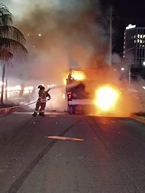 CANCÚN, Quintana Roo, 18 de enero. – Debido a una presunta falla mecánica un camión que transportaba a trabajadores de las obras de rehabilitación del bulevar Colosio se incendió esta noche en esta vialidad, sin dejar heridos.