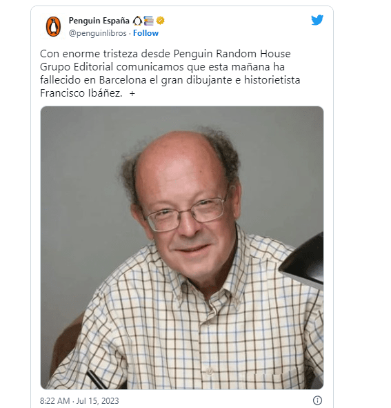 “Con enorme tristeza desde Penguin Random House Grupo Editorial comunicamos que esta mañana ha fallecido en Barcelona el gran dibujante e historietista Francisco Ibáñez.