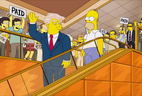 Mientras el republicano está escribiendo un tweet sobre una rival política el teléfono vuelve a sonar, promete acudir de inmediato. Pero antes su equipo tiene que maquillarlo y prepararlo durante horas. Por fin, cuando está casi listo, se revela que Trump está calvo, pero se coloca un perrito lanudo sobre la cabeza. Tras el anuncio propagandístico, Homero le dice a su mujer que votará por Trump. “Si es así, me pregunto si alguna vez podré volver a estar contigo”, le responde Marge. (FUENTE: MVS)