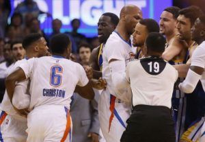 Stephen Curry, el armador de los Warriors, intercambió empujones con Semaj Christon de Oklahoma City poco antes del descanso, por lo que ambos recibieron faltas técnicas. Russell Westbrook (Thunder) y Draymond Green (Warrriors) también fueron amonestados con técnicos por participar en la gresca.