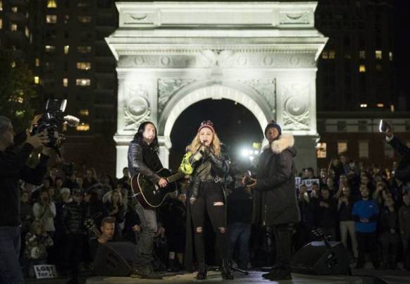 NUEVA YORK, E.U. 8 de noviembre.-Después de asegurar que haría una felación a cualquiera que votará a Hillary Clinton, Madonna resultó hoy más convincente gracias a su música en un concierto de 45 minutos improvisado en Nueva York. Había avisado con media hora de antelación en su red social favorita, Instagram, y quizá por primera vez en su carrera, apareció puntual y en un lugar normalmente reservado para artistas callejeros y turistas que se toman un respiro: la fuente de Washington Square.