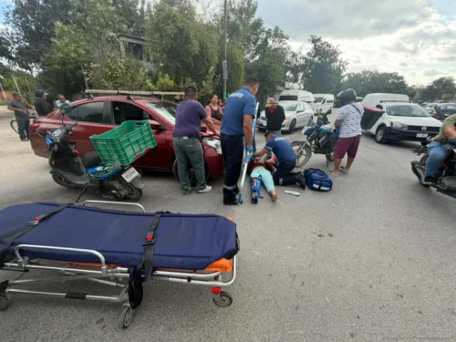 Paramédicos del Hospital Tulum acudieron al lugar y brindaron atención prehospitalaria a ambos, trasladando a la fémina a una unidad médica para una valoración más especializada. El conductor del automóvil Nissan rojo, con placas de Chiapas, permaneció en el sitio, explicó que la visibilidad estaba obstruida por vehículos estacionados y se hizo responsable de los daños.