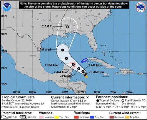 CANCÚN, Quintana Roo, 25 de octubre.- El Gobernador Carlos Joaquín informó este domingo que la Tormenta Tropical “Zeta” “se mantiene “estacionaria” aproximadamente a 445 km al sureste de Cozumel.