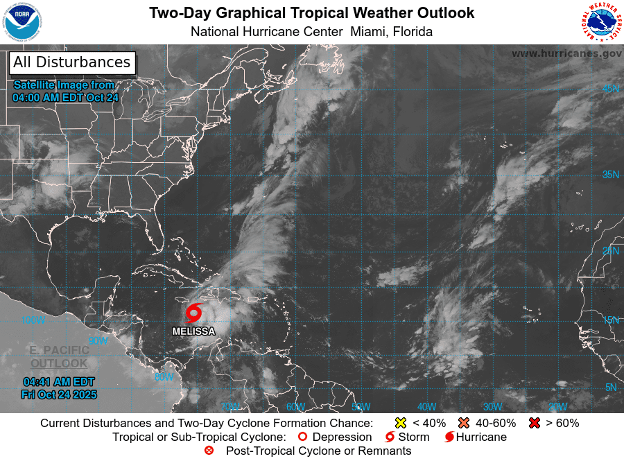 CANCÚN, Quintana Roo, 24 de octubre de 2025.— El centro de la tormenta tropical Melissa se localiza a 260 kilómetros al sur-sureste de Kingston, Jamaica, y a aproximadamente 1,325 kilómetros al este-sureste de Cancún, informó el Servicio Meteorológico Nacional (SMN). El sistema presenta vientos máximos sostenidos de 75 kilómetros por hora, rachas de hasta 95 kilómetros por hora y permanece casi estacionario sobre el océano Atlántico.