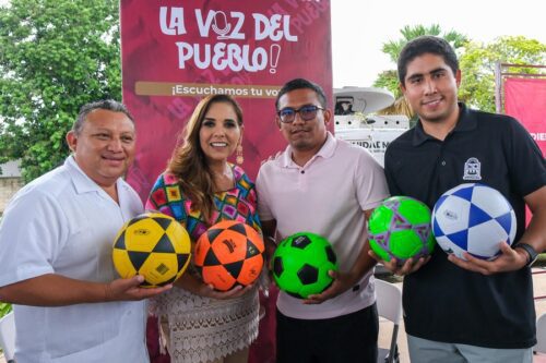 Durante el transcurso de la audiencia, la gobernadora Mara Lezama entregó material deportivo a Joezer Aké Pech, de Dziuché, quien solicitó la construcción de una cancha de fútbol 7 en su comunidad.