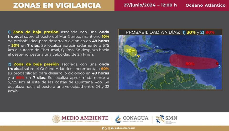 También hay otra zona de Baja Presión en el Océano Atlántico cuya probabilidad de desarrollo ciclónico se incrementa a 60% en las próximas 48 horas y a 80% en 7 días. Se encuentra a 5,725 km al Este de las costas de Quintana Roo con un desplazamiento hacia el Oeste a una velocidad entre 24 y 32 kph.
