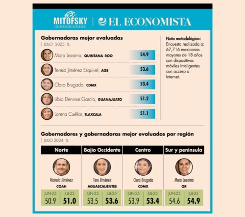 El ranking de julio lo encabezó la gobernadora de Aguascalientes, Mara Lezama (54.9%); seguida de Tere Jiménez (53.6%) y Clara Brugada (53.4%).