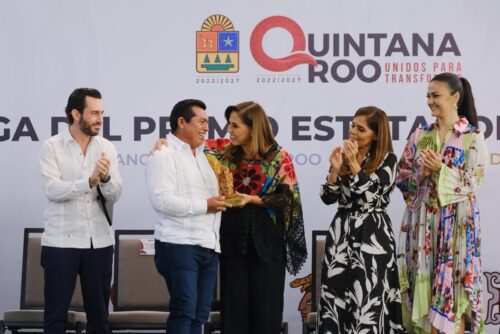 Cancún.- La gobernadora Mara Lezama Espinosa entregó el Premio Estatal de Turismo 2025 a la empresa comunitaria Community Tours Sian Ka’an durante un evento que se celebró en este destino turístico de clase mundial y que recibió su presidente Alberto Cen Caamal.
