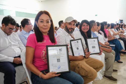 Chetumal.– Empresarios y productores locales recibieron 14 certificados “Hecho en México”, que representan el reconocimiento oficial a la calidad, identidad y potencial exportador de los productos locales, de manos de la gobernadora Mara Lezama Espinosa y del secretario Economía Marcelo Ebrard Casaubón.