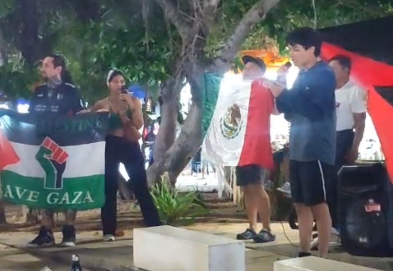 Playa del Carmen, Quintana Roo, 02 de octubre de 2025.– Integrantes del Colectivo Quintana Roo por Palestina realizaron una manifestación en el Parque Fundadores para denunciar la intercepción de una flotilla internacional que transportaba ayuda humanitaria hacia la Franja de Gaza y que fue detenida por autoridades israelíes. Entre los tripulantes se encontraban ciudadanos mexicanos, lo que motivó un llamado a la Secretaría de Relaciones Exteriores para que brinde protección y gestione su liberación.