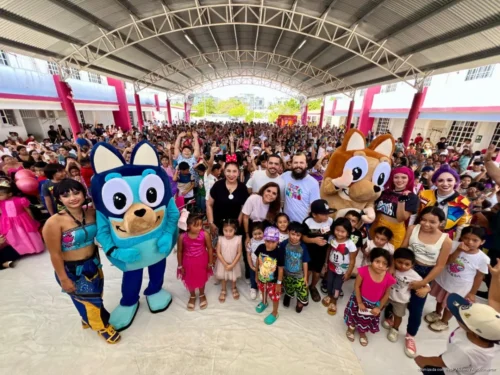 En la comunidad Francisco May, de Isla Mujeres, Mara Lezama dio inicio a la celebración con un festival lleno de sonrisas, música y entusiasmo, donde las niñas y niños disfrutaron de espectáculos infantiles, dinámicas recreativas, botargas, rifas y entrega de regalos.