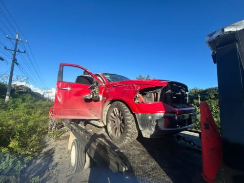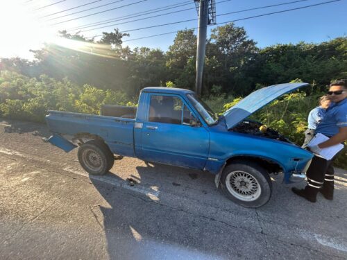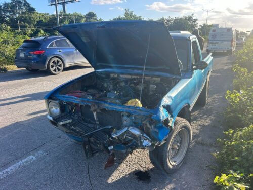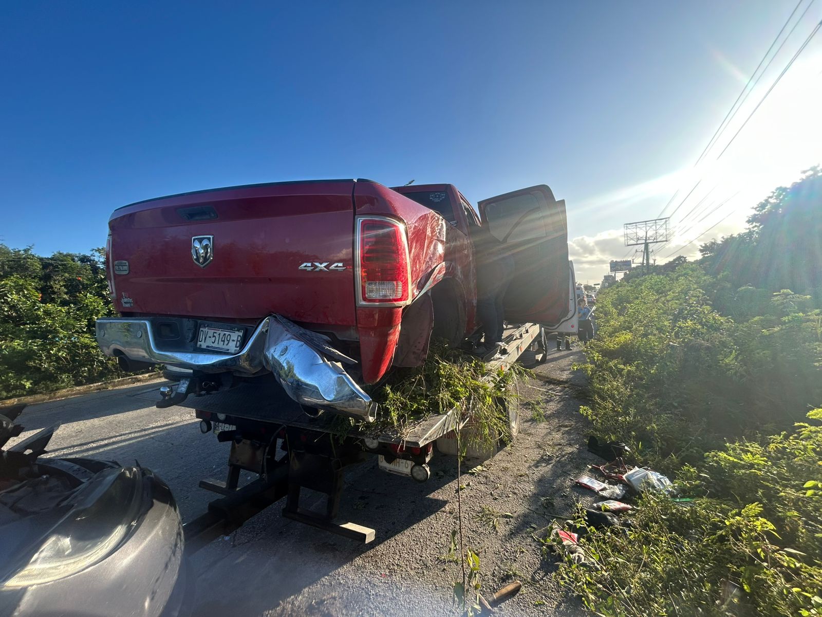 PLAYA DEL CARMEN, Quintana Roo, 16 de diciembre de 2025.- Una camioneta terminó volcada la tarde de este martes sobre la carretera federal 307, luego de ser impactada por un vehículo conducido por un menor de edad que no respetó el alto en un retorno. En el accidente también resultó dañada una tercera unidad como impacto colateral.