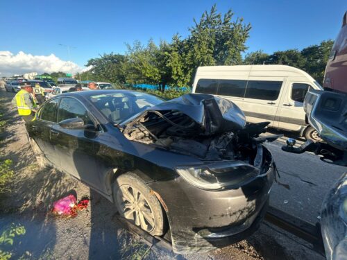 El impacto proyectó a la camioneta Dodge fuera de la vialidad, donde chocó contra una Nissan azul que circulaba en el carril derecho. Debido al giro y la fuerza del golpe, la Dodge quedó entre la maleza y perdió una de sus llantas traseras.
