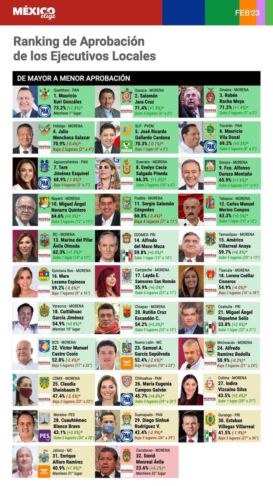 La medición es liderada por el Partido Acción Nacional (PAN), con Mauricio Kuri González en Querétaro con 73.2 por ciento de la aprobación de sus ciudadanos.