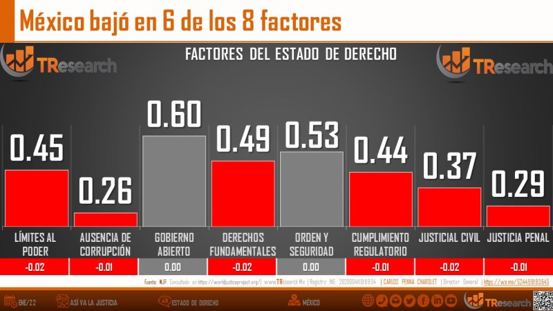 La posición de México de debe a que el país bajó en seis de ocho factores que son límites del poder, ausencia de corrupción, derechos fundamentales, cumplimiento regulatorio, justicia civil y justicia penal.