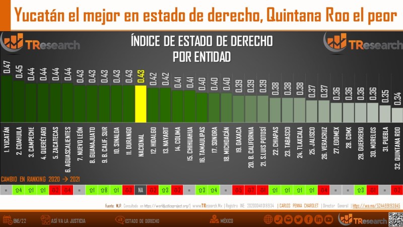 Al interior, por entidad, Yucatán fue el estado con mejor estado de derecho y Quintana Roo, pese a su cercanía geográfica, el peor.