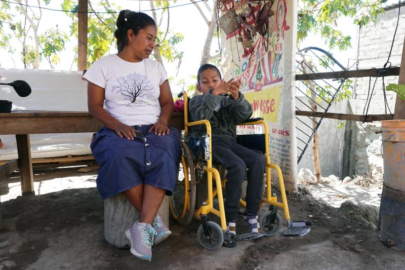 Siempre a su lado, Edith García, madre de Alan y trabajadora del hogar, no solo es quien empuja la silla, sino la que sigue el tratamiento día con día.