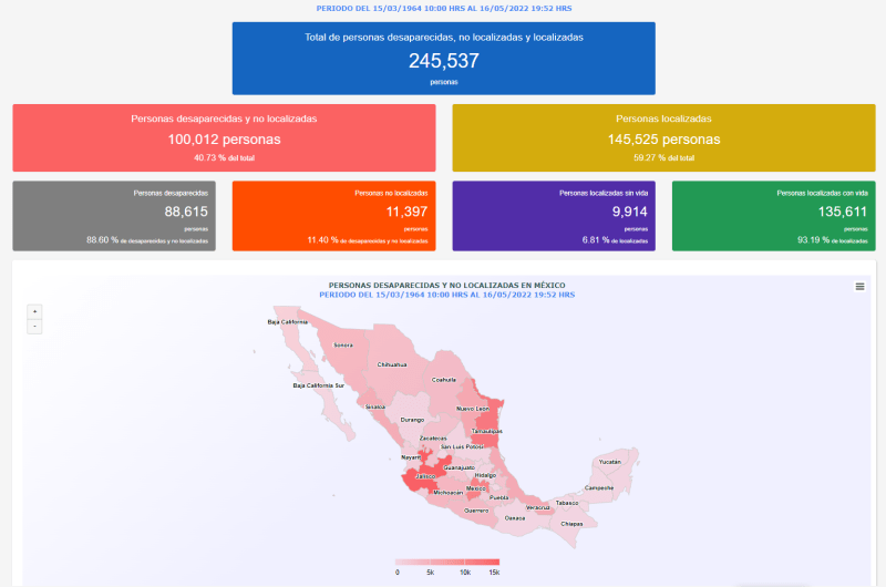 De acuerdo con los datos, desde el 15 de marzo de 1964 al 16 de mayo de este año, suman 100 mil 12 personas con el estatus de desaparecidas.