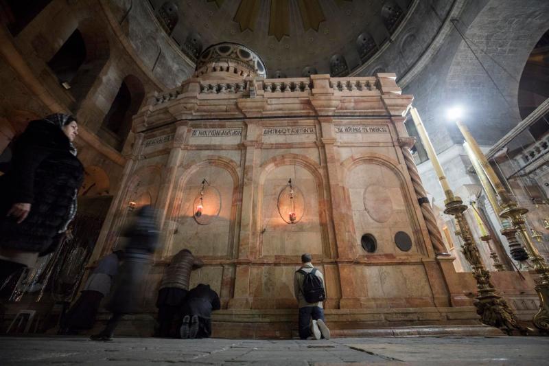 Agolpados alrededor de la tumba, cristianos ortodoxos, armenios, coptos y siríacos, venidos desde diferentes latitudes, llaman con fuertes cánticos y tambores al patriarca ortodoxo griego, Teófilo III, para que ore en soledad dentro el Edículo hasta que se haga el fuego.