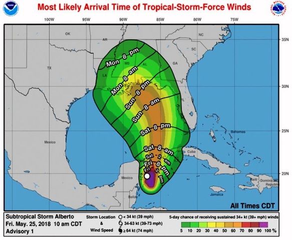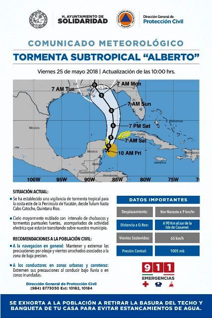 El NHC ha comenzado los avisos sobre la recién formada tormenta sub tropical Alberto. Se centra alrededor de 195 millas (315 km) al suroeste de la punta occidental de Cuba. Informó que el Gobierno de México ha emitido un aviso de tormenta tropical para la costa este de la Península de Yucatán desde #Tulum hasta #CaboCatochde. Las condiciones de tormenta tropical son posibles dentro del área de vigilancia hasta el sábado. Los vientos máximos sostenidos están cerca de 40 km / h (65 km / h) con ráfagas más altas. Se prevé un fortalecimiento gradual para las próximas 72 horas.