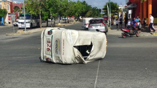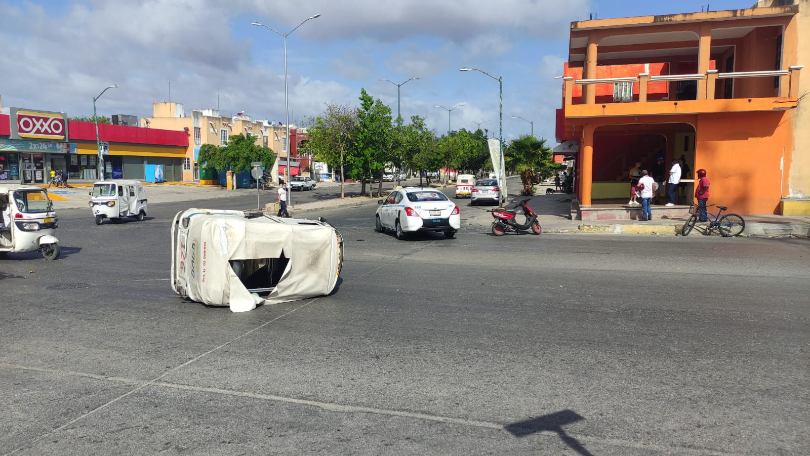 PLAYA DEL CARMEN, 21 de mayo.- Un mototaxi y una motocicleta colisionaron en las inmediaciones del populoso fraccionamiento Villas del Sol, el lugar donde se registró el percance a sido cede de innumerables accidentes.