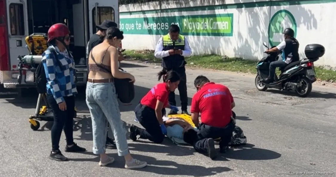 PLAYA DEL CARMEN, Quintana Roo, 14 de abril de 2026.- Un motociclista fue trasladado al hospital luego de impactarse contra la parte trasera de un taxi en una de las entradas del fraccionamiento Real Ibiza, presuntamente por circular a exceso de velocidad y no percatarse de que la unidad de alquiler disminuyó su marcha.