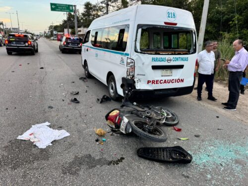El accidente ocurrió entre las avenidas Chemuyil y Arco Vial, cuando el conductor de una motocicleta Italika 110, color negro, circulaba en dirección sur y no advirtió que la unidad del sindicato Lázaro Cárdenas del Río, con número económico 218, había reducido su velocidad.