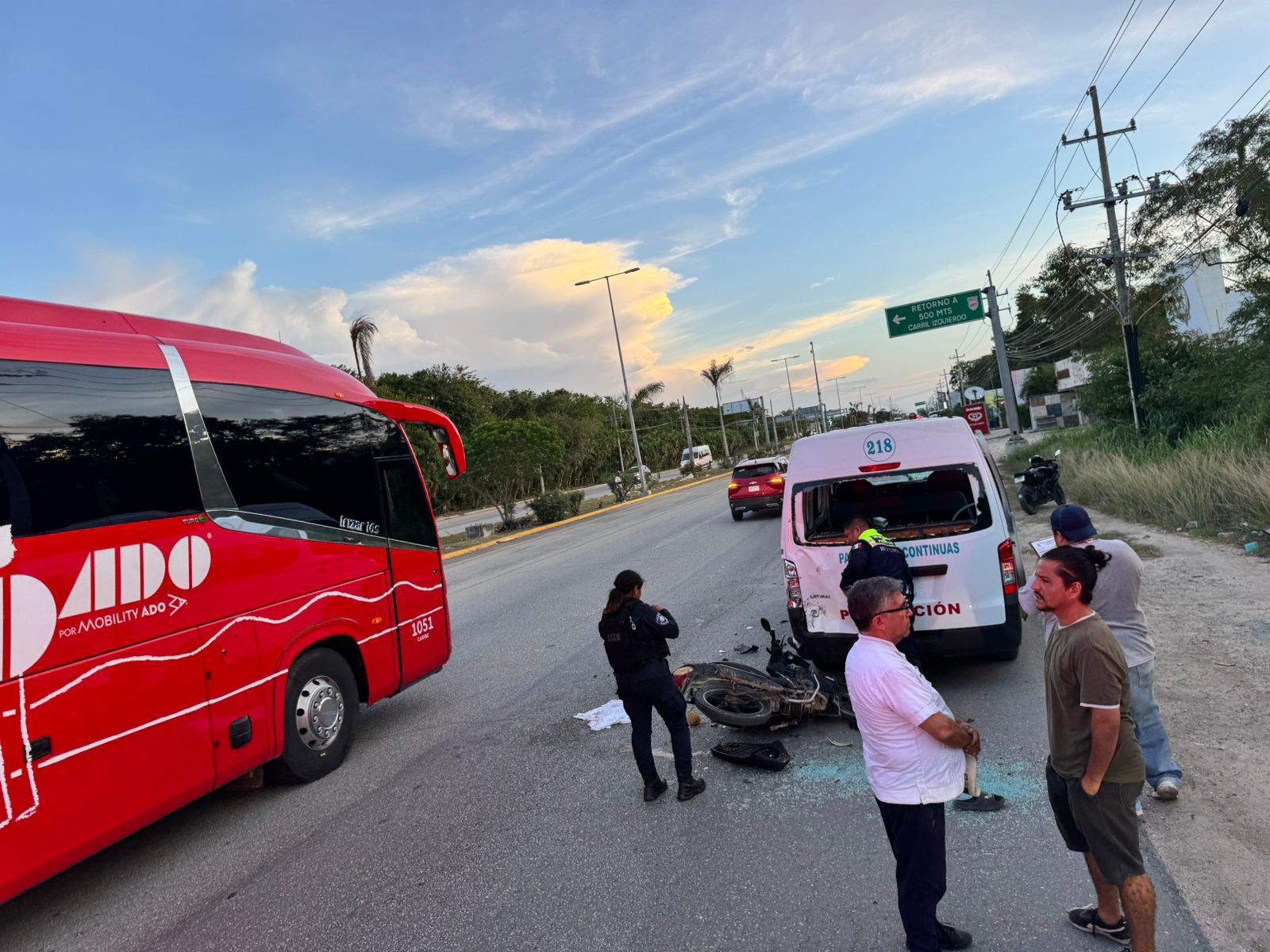 El accidente ocurrió entre las avenidas Chemuyil y Arco Vial, cuando el conductor de una motocicleta Italika 110, color negro, circulaba en dirección sur y no advirtió que la unidad del sindicato Lázaro Cárdenas del Río, con número económico 218, había reducido su velocidad.
