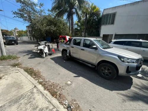 PLAYA DEL CARMEN, Quintana Roo, 16 de febrero de 2026.– Un conductor de mototriciclo resultó lesionado luego de provocar un accidente al no respetar su alto en calles de la colonia Ejido, donde terminó impactándose contra una camioneta con preferencia de paso y volcó tras el fuerte choque.