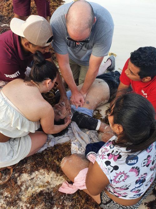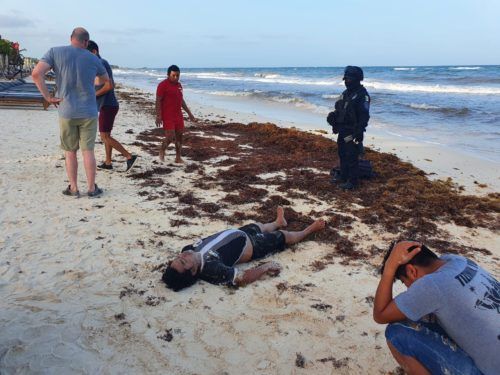 La primera muerte por ahogamiento se reportó a las 17:26 horas y fue a la altura del hotel Zulum, y se trata Víctor Manuel Cahuich Ek, de 23 años, originario de Señor Quintana Roo de oficio garrotero en Hotel Zulum, de quien su esposa informó que ya tenían más de media hora tratando de reanimarlo, pero que hasta ese momento no daba respuesta de signos vitales.
