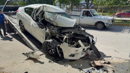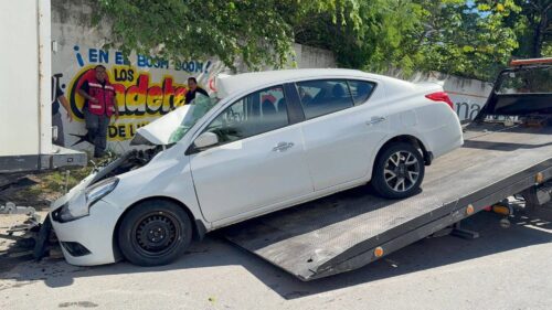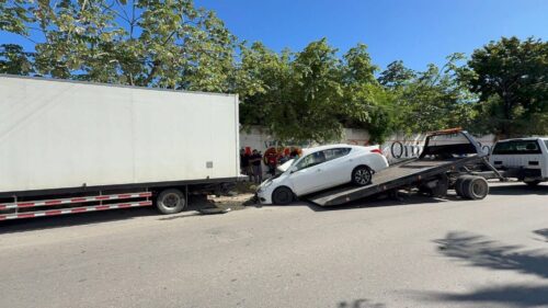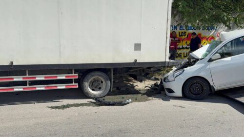 PLAYA DEL CARMEN, Quintana Roo, 21 de octubre de 2025.— Una mujer de la tercera edad resultó lesionada luego de chocar su vehículo contra la parte trasera de un camión de carga de la empresa Liverpool, que se encontraba estacionado sobre la avenida 125 con calle 6, en la colonia Ejidal.