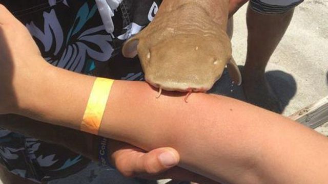 FLORIDA, EE.UU, 16 de Mayo.- Una mujer atacada por un tiburón mientras se bañaba en Florida, en el sureste de Estados Unidos, fue trasladada a la urgencia del hospital con el animal aún prendido a su brazo, informaron los medios locales. El pequeño tiburón gata, de 60 cm de largo, tenía sus dientes totalmente incrustados en el brazo de la nadadora. Para llevarla al hospital, los socorristas fabricaron una férula especial que sostenía el brazo y el tiburón a la misma vez, precisó el South Florida Sun-Sentinel.
